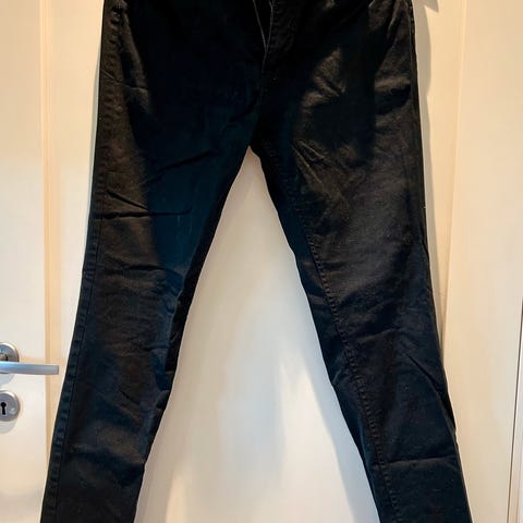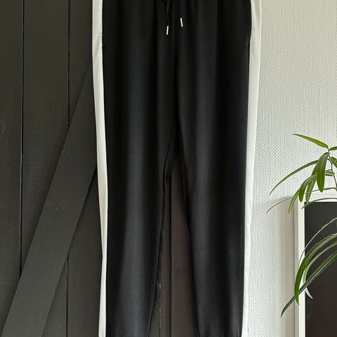 Fin svart bukse, litt joggebukseaktig i livet med hvit snøring. Fra leggene og ned er stoffet rynket + glidelås helt nederst. 98% bomull, 2% elastan. Sendes mot frakt.