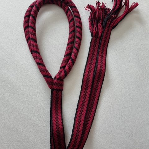 Håndhevet vippe til beltestakk i rødt, rosa, lys gul, grønt og sort. Dessverre for stor til vår konfirmant.