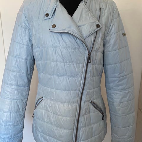 Vattert jakke for dame i størrelse L( passer størrelse M) Jakken er blå med rosa fôr og er laget i polyester. Den har hette, glidelås i front og sidelommer med glidelås. Quiltet mønster gir jevn fordeling av vattering. Egnet som lett ytterjakke i overgangssesonger eller milde vinterdager.