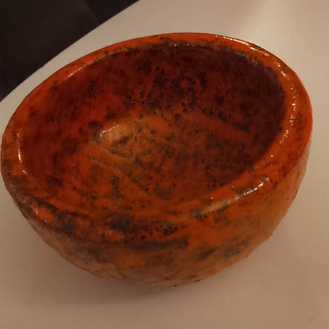 Selger en pent brukt bolle fra Fait Main i keramikk. Bollen har en diameter på 23 cm og en høyde på 6 cm, og kommer i en flott kombinasjon av blå og gul. Den er i god stand og har vært lite brukt Passer godt til servering eller som dekorasjon. Ta kontakt ved interesse!