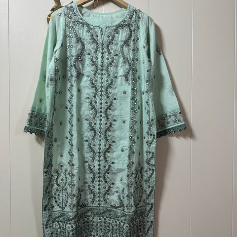 Superfin suit fra Junaid Jamshed (J.) i strl L. Selges helt nytt med lapp på. Antrekket kommer med matchende dupatta/sjal.