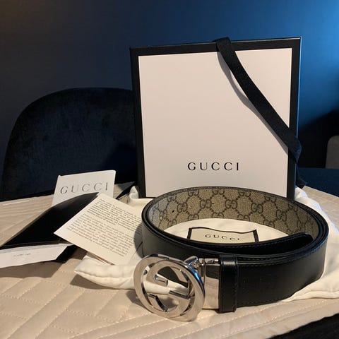 Gucci belt for sale. Never used and fits a 29-inch waistline. It’s black in color and comes with the original box and Gucci dust bag. Letting it go for NOK 3890