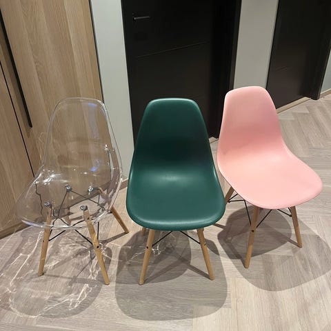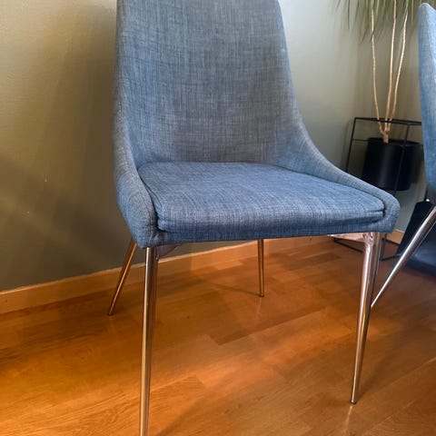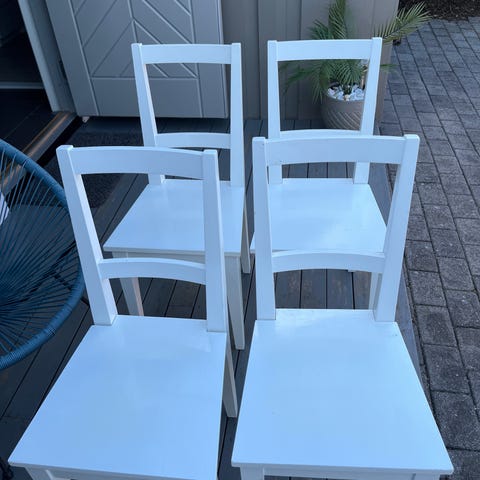 3 stk stoler, en blå, en rosa, en gul. Har vært brukt til vanlig spisebord og til voksne. Litt slitt maling her og der men veldig solid og fine. De er litt mindre en vanlige stoler.