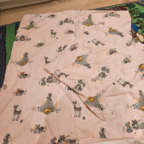 Et dynetrekk i str 65x80cm og et i str 80x100. Det største dynetrekket i rosa sateng har medfølgende putetrekket.