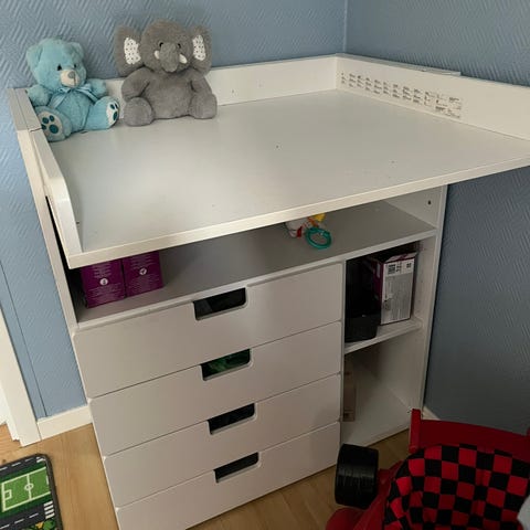 Praktisk stellebord som sparer plass. Du hekter pleiedelen direkte over krybben. Høye kanter rundt skjøtene gir ekstra sikkerhet. Materiale: bjørk og MDF. Mål 55 x 75,7 cm. Yttermål: bredde: 59 cm, dybde: 75 cm. Passer barneseng i standard størrelse, 120 x 60 cm.