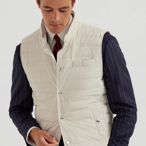Brunello Cucinelli's shell gilet is quilted to ensure an equal distribution of warm down throughout. It fastens with a row of snaps that extend into the collar for a bit of extra protection from the elements and is finished with lanted pockets to secure small essentials.