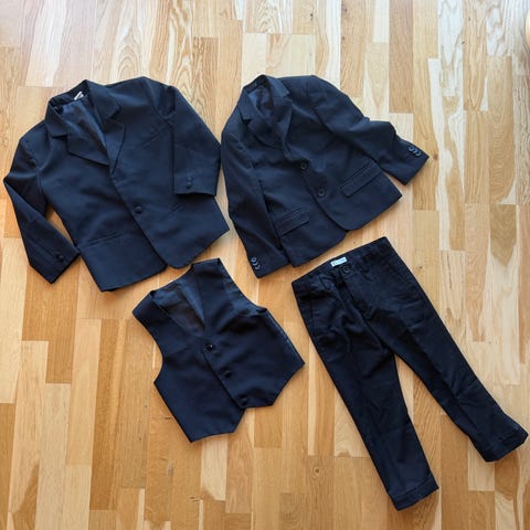 Pent brukte dressjakker, dressbukser og hvitskjorte selges samlet eller separat. Kr 100 pr del, evt samlerabatt ved kjøp av flere.