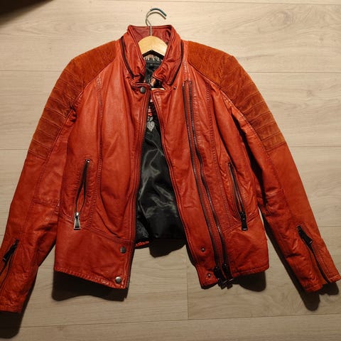 Sjelden spesialbestilt mc-jakke til dame. Str 38. Stilige broderier og pikant passform med innsving og glidelåser for bedre tilpassing. kan glides på bukse i samme merke.
