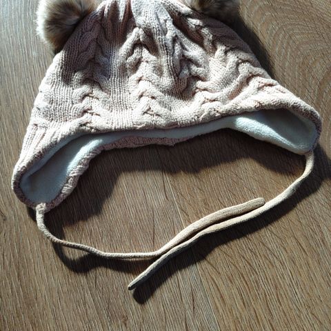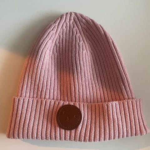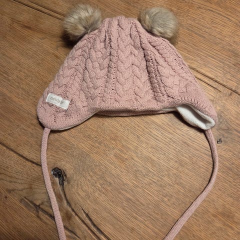 Selger en pent brukt rosa babylue i økologisk bomull med knyting og søte dusker.