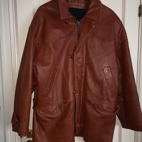 Skinnjakke i tykt og solid lær fra det spanske merket «Torras». Dobbel ytterlomme og lommer på innsiden. Markert som en størrelse «52», så er ganske stor, men fungerer godt som oversized.