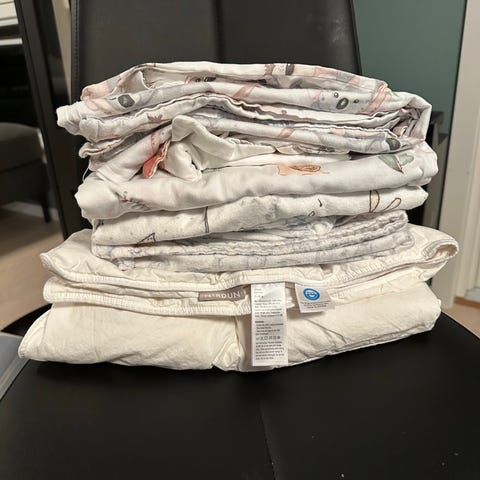Lillesand duvet med 3 stk. laken med stikk og 1 uten, plus 3 stk sengesett.