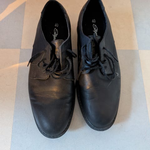 Meget pent brukte skinnsko fra Fly Of London selges kr 370 frakt inkl. Både snøring og borrelås.