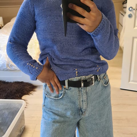 Marineblå høyhalset blandingsgarn ( ull, alpaca og akryl). Fiskebeinstrikk. Strl S- La Redoute fin passform. Høyhalset genser, varm og god.