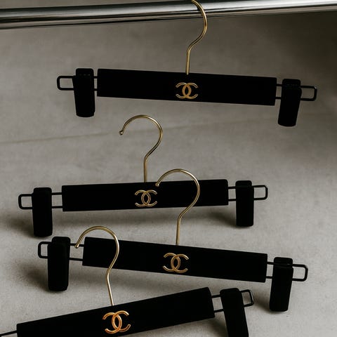 5 kleshengere fra Chanel. Den ene er litt lysere i fargen og er mest brukt så har derfor også noen merker. Man ser ikke så mye forskjell på fargen når de henger oppe i et skap. I formen er alle ganske like, men de har noen forskjeller i størrelse. Dette kommer litt an på hvilket plagg de har fulgt med.