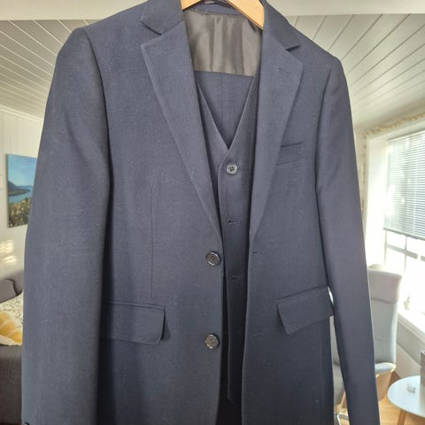 Selger ein mørkeblå dress til ungdom frå merket Pascal. Er dressjakke, vest og bukse. Står str 165-14 i dressen. Er av typen slim fit. Følgjer med oppbevaringspose.