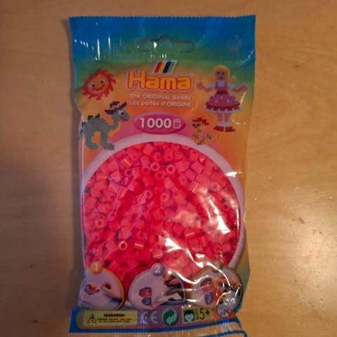 Selger en liten pakke med små perler ink. brett. Pakken er eldre og har ligget i en bod lenge, derfor er den litt rufsete i pappen men den er ikke åpent.
