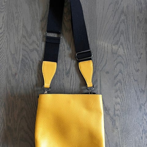 Skinn veske i gul farge. Vesken har en justerbar skulderrem med hull for tilpasning og en glidelåslukking. Innvendig finnes flere lommer for organisering av små gjenstander. Materialet er lær, og vesken har et enkelt og funksjonelt design.
