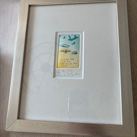 Trykket består av to små bilder og har tittelen «Fløy en liten blåfugl» og «Fri».