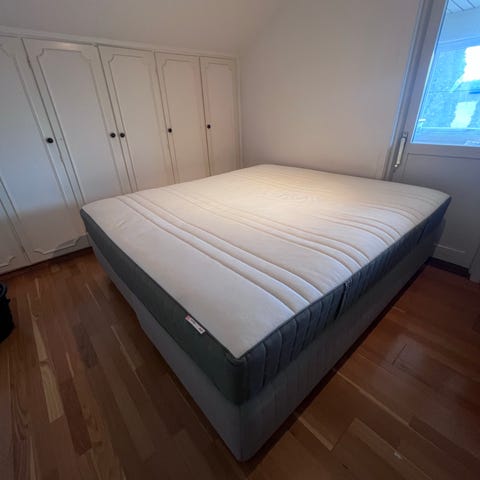 Selges uten overmadrass da vi ønsker å beholde denne. Sengen er FastxFast. DUNVIK trekk inkludert. Opprinnelig pris totalt 8.600,-.