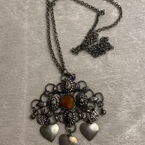 Selger ett sølvfarget (noen gyldne detaljer)langt halskjede, utsmykket med stener fra A&C (Arts and Craft). Kjedet måler ca. 90 cm.