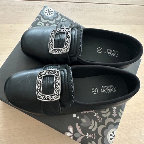 Bunadsko fra Folklore, størrelse 30. Kjøpt i fjor, brukt en gang. Har noen merker fremst på skoen, men utenom det veldig pent brukt. Veldig myke og behagelige på.