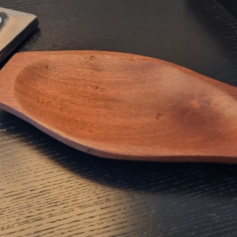 Dekorativ liten skål formet som en fisk, håndlaget i vakkert treverk med fin glød og jevn finish. Skålen måler ca. 18 cm i lengde og er både praktisk og dekorativ – perfekt til nøtter, smågodt, smykker eller som pynt.