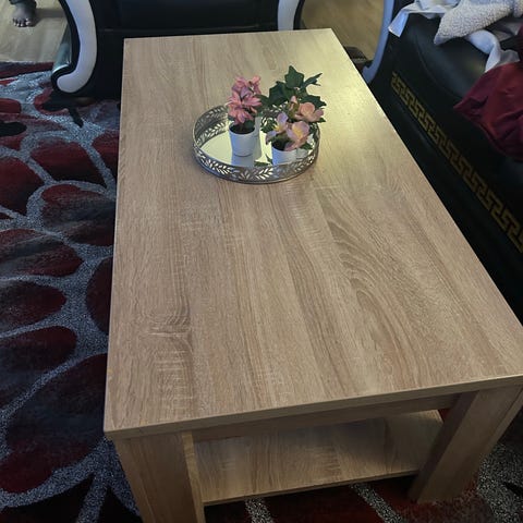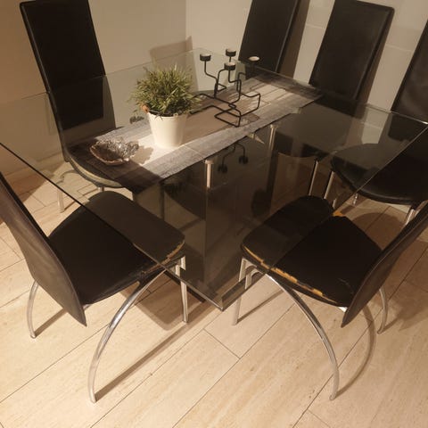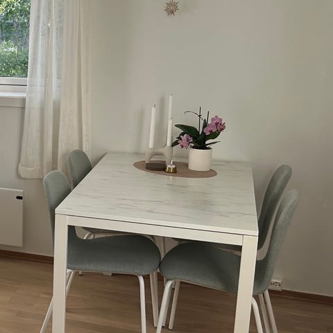 Fint brukt spisebord! Veldig solid og god kvalitet, ett kraftig bord som holder lenge. Fint overflate, enkel å rengjøre. Ikke mye synlige bruksmerker. Stolene er 4stk, de er gode å sitte på og veldig behagelige. Noen små bruksmerker men ikke veldig sjenerende. Bordet kan forlenges så det blir 170 cm lang