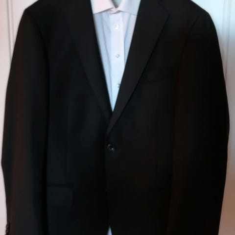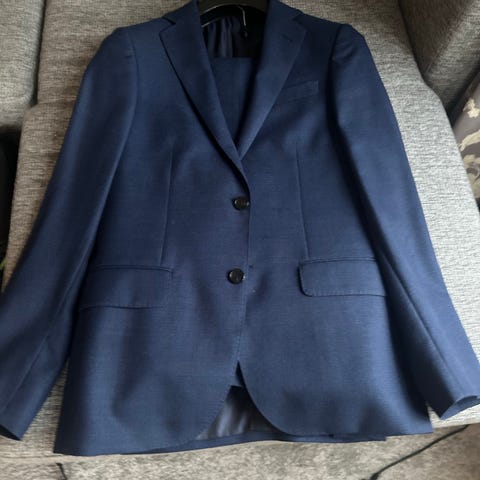 Nesten ikke brukt dress fra Mario Conti (fra Match) jakken er 50/B2 og buksen er str. 48/B2. B2 betyr ekstra lange ben (tilsvarer ca 34 tommer). Passer til en som er høy og smal. Dressen er marineblå, ser litt lys ut på bildene. (Har også flere mørke dresser til salgs, ta kontakt)
