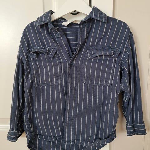 Hvit skjorte fra H&M. Står str 116, men liten i str så tilsvarer mer str 110. Fine detaljer. Knapper for å kunne brette opp ermene når det er varmt.