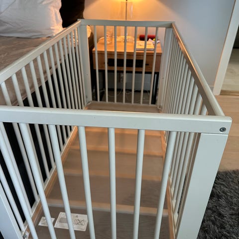 En fin barneseng med noen eksta utstyr