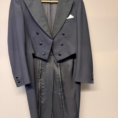 Sjakett jakke str 14 var sjå sydame for og legge den opp i armer og knappen i livet. Har tatt ner armene igjen men knappen må omsys.