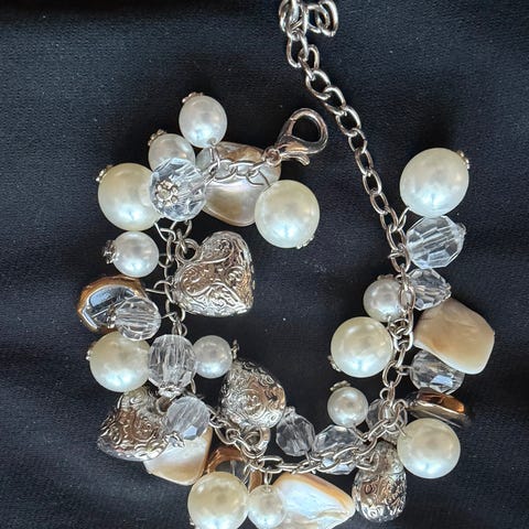 Armbånd med innslag av kunstperler, perlemor og krystall.