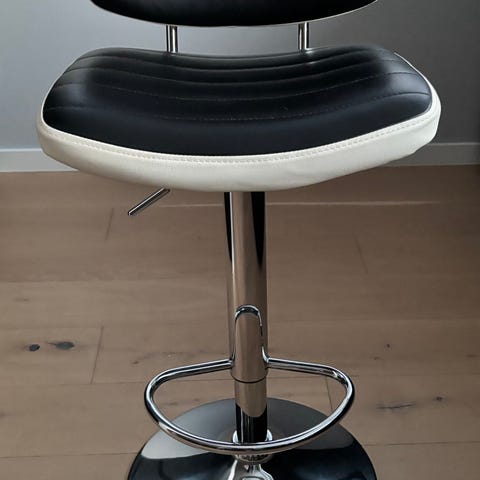 Barstol i rød regenerert skinn og krom selges. Merket Dan Form. Tror navnet er Barhocker Sun3. Den har 360 graders svingradius. Ser fin ut.