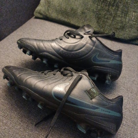 Nike Tiempo med AG-knotter, som først og fremst benyttes på kunstgressbaner. Skoene er i størrelse 45 (se bilde). Skoene er noen år gamle og har en del bruksmerker, men her er det fortsatt mye sko igjen. Se bilder for bruksmerker. Mangler såler til å ha i skoene, fordi jeg tok ut disse og finner de ikke igjen (bruker andre såler selv). Selges pga overgang til andre sko.
