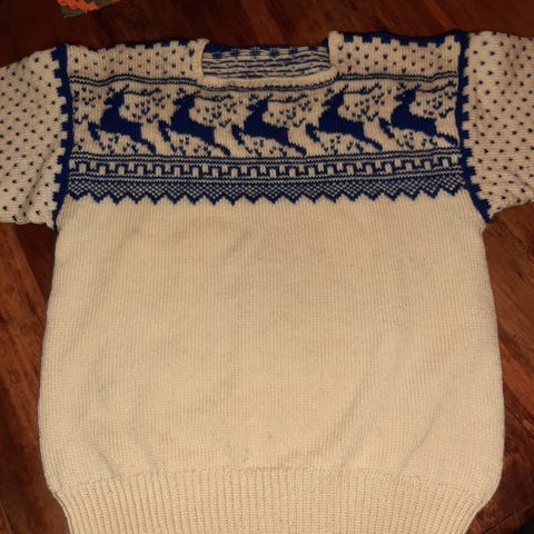 Genser strikket i garnet Pelz fra Gjesdal. farge 826 rød/purpur print. med raglanfelling.