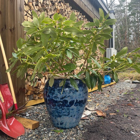 3 rhododendron busker til salgs. Den ene har begynt å blomstre med hvite blomster. Først var de rosa, så ble de hvite. De to andre buskene har ikke begynt å blomstre enda.