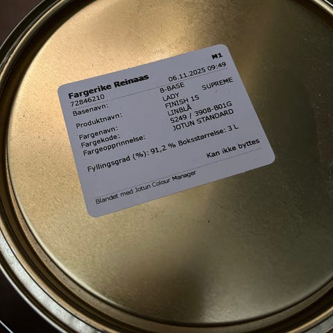 2.7 liters spann med fargen Longyearbyen FR1041. Kjøpte et spann for mye på Fargerike. Matt veggmaling. I hovedsak blå av farge.