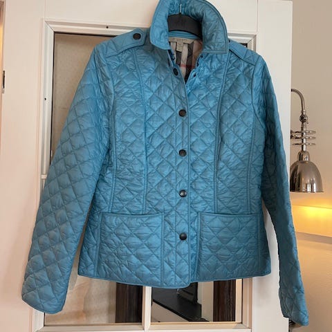 Selger en ubrukt og klassisk vattert jakke fra Burberry Brit i størrelse S. Elegant og tidløs modell i sort med ikoniske rutete detaljer på innsiden.
