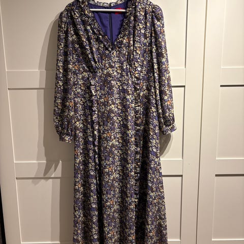Det er mange fine detaljer på kjolen, spesielt peplum detalj rundt livet er flatterende. Det er skult glidelås i ryggen og liten splitt bak nederst, se bildene. Kjolen er kun brukt 2 ganger og er som ny, ingen flekker, hull eller lignende.