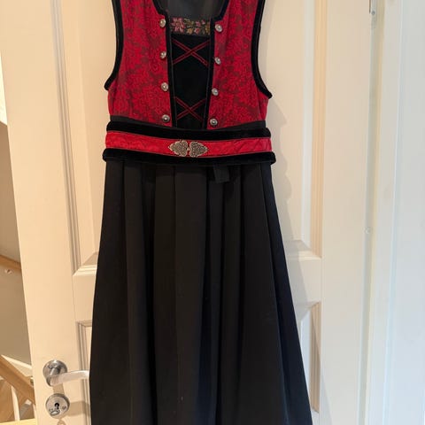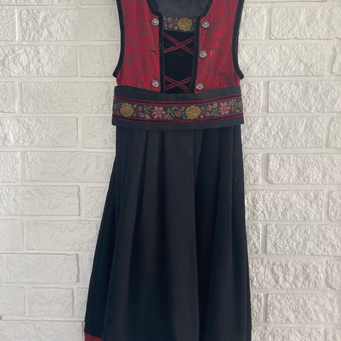 Selger en festdrakt til jente i rød og sort, størrelse 104. Noen litt løse trådender i sidene, går sikkert fint å bare klippe de. Selges uten skjorte. Kan hentes i Børsa eller bringes til Brattøra torsdag 15.5 på dagtid.