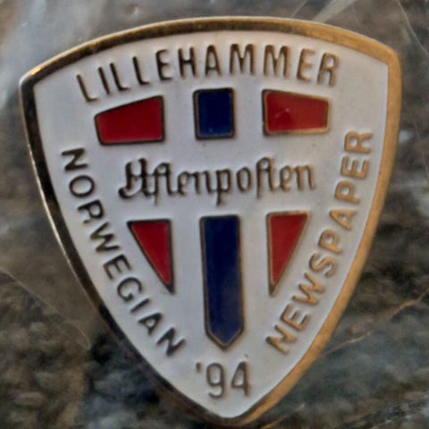 Pin med Lillehammer by-/kommunevåpen, Lillehammer Politilag og OL-året 1994.