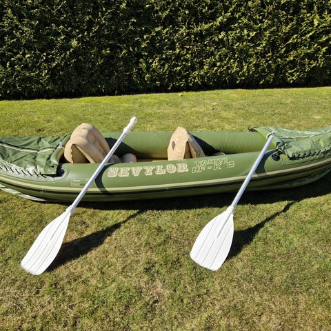 Veldig pent brukt oppblåsbar kano. Komplett Gumotex Palava med tre tofter/ seter, to kanoårer, gunnibåtpumpe og transport tørrsekk medfølger.