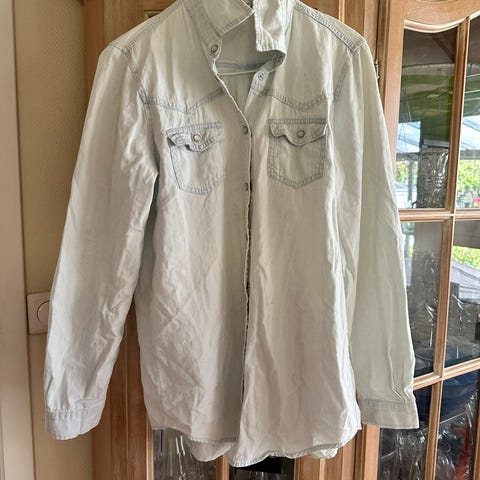 Selger en lite brukt lyseblå (denim) lyocell skjorte med nagler. Str. 40. Skjorten henger fint på kroppen da den er 100 % lyocell. Selges for 250.-