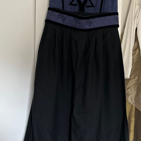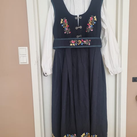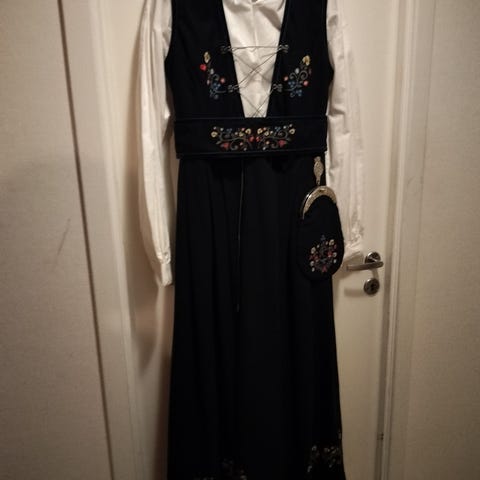 Selger relativt ny festdrakt som er kun brukt to ganger, kjøpt ny i ettertid så har ikke behov for to, er str 42/44., har litt flekker i kragen etter sminke, muligens det går å klore det vekk, men er på innsiden så er av liten betydning.