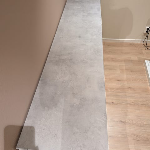 Det er skruefester i mdf på undersiden, så hvis du trenger å skru den fast i resten av møbelet, så er det enkelt å skru fast ting uten at steinplaten sprekker. V har ikke skrudd den fast, så den er hullfri og helt som ny der.