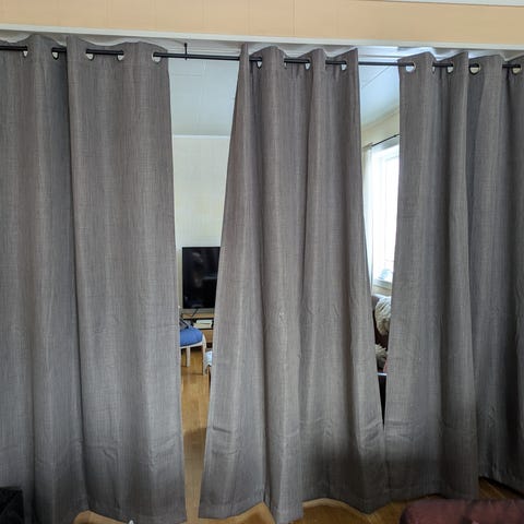 Mørk blå gardiner. Litt tendens til solbleket på baksiden, men ikke synlig.