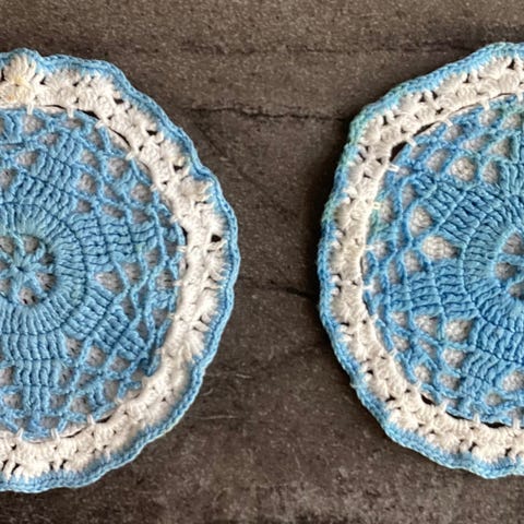 10 hekla bordskånarar / bordskånere i tynt, blått bomullsgarn kledd over små, klare plastfat. Diameter 8 cm. Kr 110 + ev. porto. Eg bruker ikkje betalings/ sendingsløysinga Fiks ferdig.