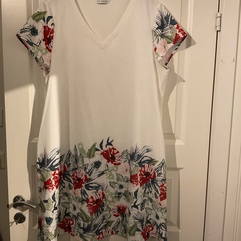 Kjolen er ny, den har en liten skade på baksiden som vises på bildene . Kjolen har lommer . Skaden ble oppdaget etter kjolen ble kjøpt og prøvde å reparere med lim. Jeg er 1,58 m
