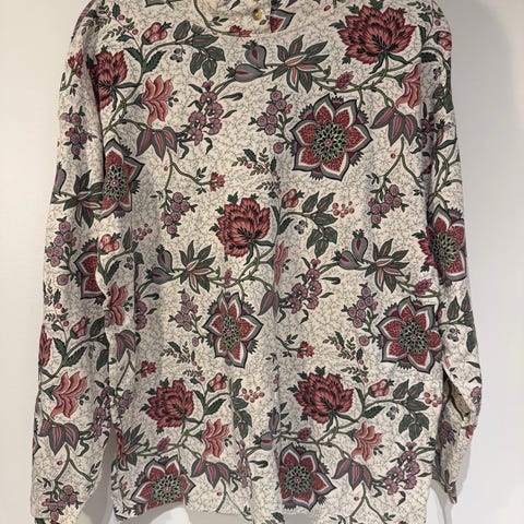 Nysydd skjorte i med burgunder og rosa blomster til beltestakk /bunad/ festdrakt i 100 % bomullspoplin. Sydd med fransk søm. Lett og behagelig å ha på seg. Krøller lite så lett å vedlikeholde.