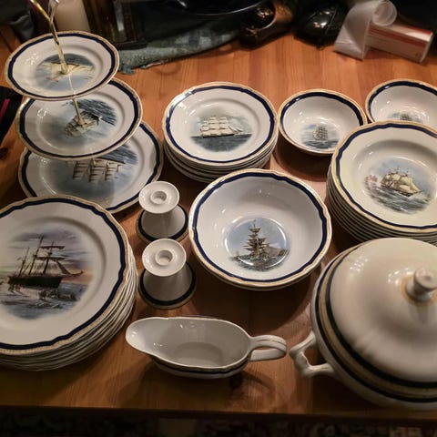 Dype tallerkner fra Skuteserviset Firkløver Porsgrund. Samme motiv på alle. Selges samlet.